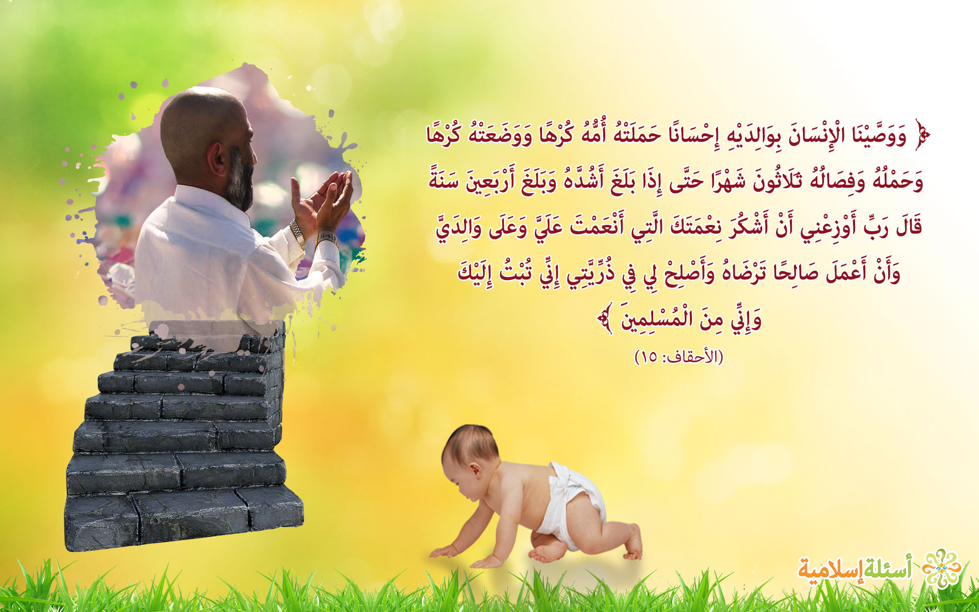 وَوَصَّيْنَا الْإِنْسَانَ بِوَالِدَيْهِ إِحْسَانًا حَمَلَتْهُ أُمُّهُ كُرْهًا وَوَضَعَتْهُ كُرْهًا  وَحَمْلُهُ وَفِصَالُهُ ثَلَاثُونَ شَهْرًا حَتَّى إِذَا بَلَغَ أَشُدَّهُ وَبَلَغَ أَرْبَعِينَ سَنَةً قَالَ رَبِّ أَوْزِعْنِي أَنْ أَشْكُرَ نِعْمَتَكَ الَّتِي أَنْعَمْتَ عَلَيَّ وَعَلَى وَالِدَيَّ وَأَنْ أَعْمَلَ صَالِحًا تَرْضَاهُ وَأَصْلِحْ لِي فِي ذُرِّيَّتِي إِنِّي تُبْتُ إِلَيْكَ وَإِنِّي مِنَ الْمُسْلِمِينَ