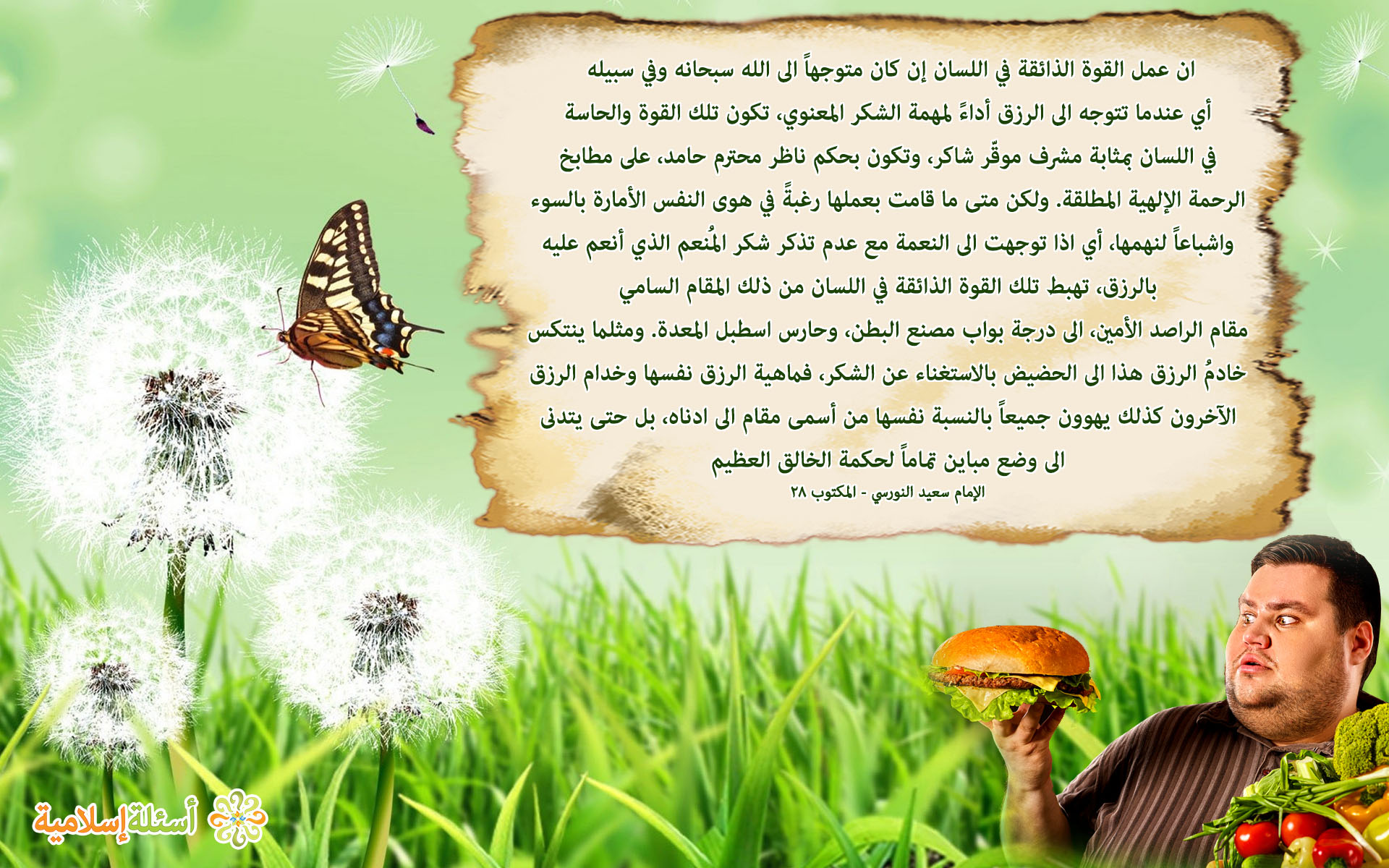 ان عمل القوة الذائقة في اللسان إن كان متوجهاً الى الله سبحانه وفي سبيله أي عندما تتوجه الى الرزق أداءً لمهمة الشكر المعنوي، تكون تلك القوة والحاسة في اللسان بمثابة مشرف موقّر شاكر، وتكون بحكم ناظر محترم حامد، على مطابخ الرحمة الإلهية المطلقة. ولكن متى ما قامت بعملها رغبةً في هوى النفس الأمارة بالسوء واشباعاً لنهمها، أي اذا توجهت الى النعمة مع عدم تذكر شكر المُنعم الذي أنعم عليه بالرزق، تهبط تلك القوة الذائقة في اللسان من ذلك المقام السامي مقام الراصد الأمين، الى درجة بواب مصنع البطن، وحارس اسطبل المعدة. ومثلما ينتكس خادمُ الرزق هذا الى الحضيض بالاستغناء عن الشكر، فماهية الرزق نفسها وخدام الرزق الآخرون كذلك يهوون جميعاً بالنسبة نفسها من أسمى مقام الى ادناه، بل حتى يتدنى الى وضع مباين تماماً لحكمة الخالق العظيم