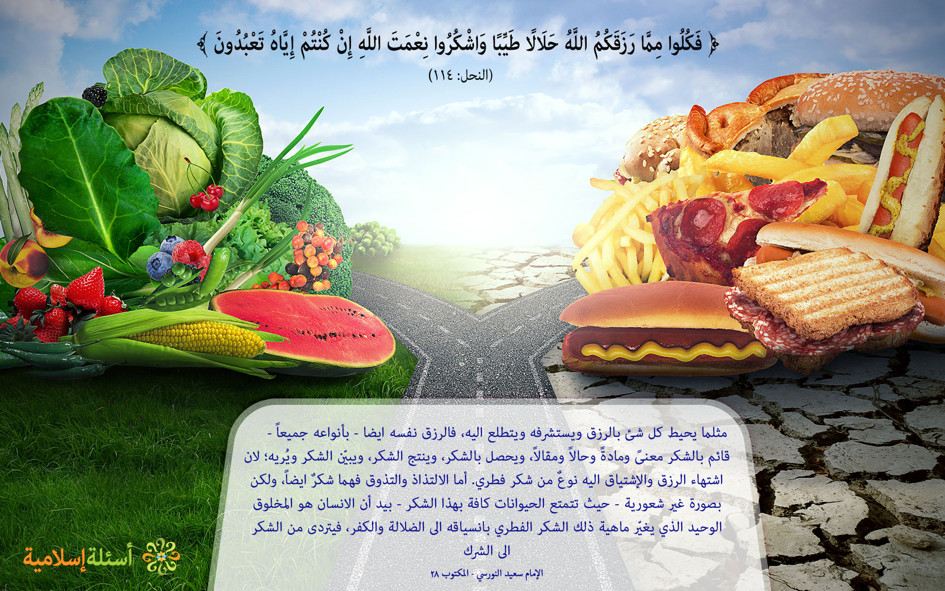 ﴾ فَكُلُوا مِمَّا رَزَقَكُمُ اللَّهُ حَلَالًا طَيِّبًا وَاشْكُرُوا نِعْمَتَ اللَّهِ إِنْ كُنْتُمْ إِيَّاهُ تَعْبُدُونَ ﴿