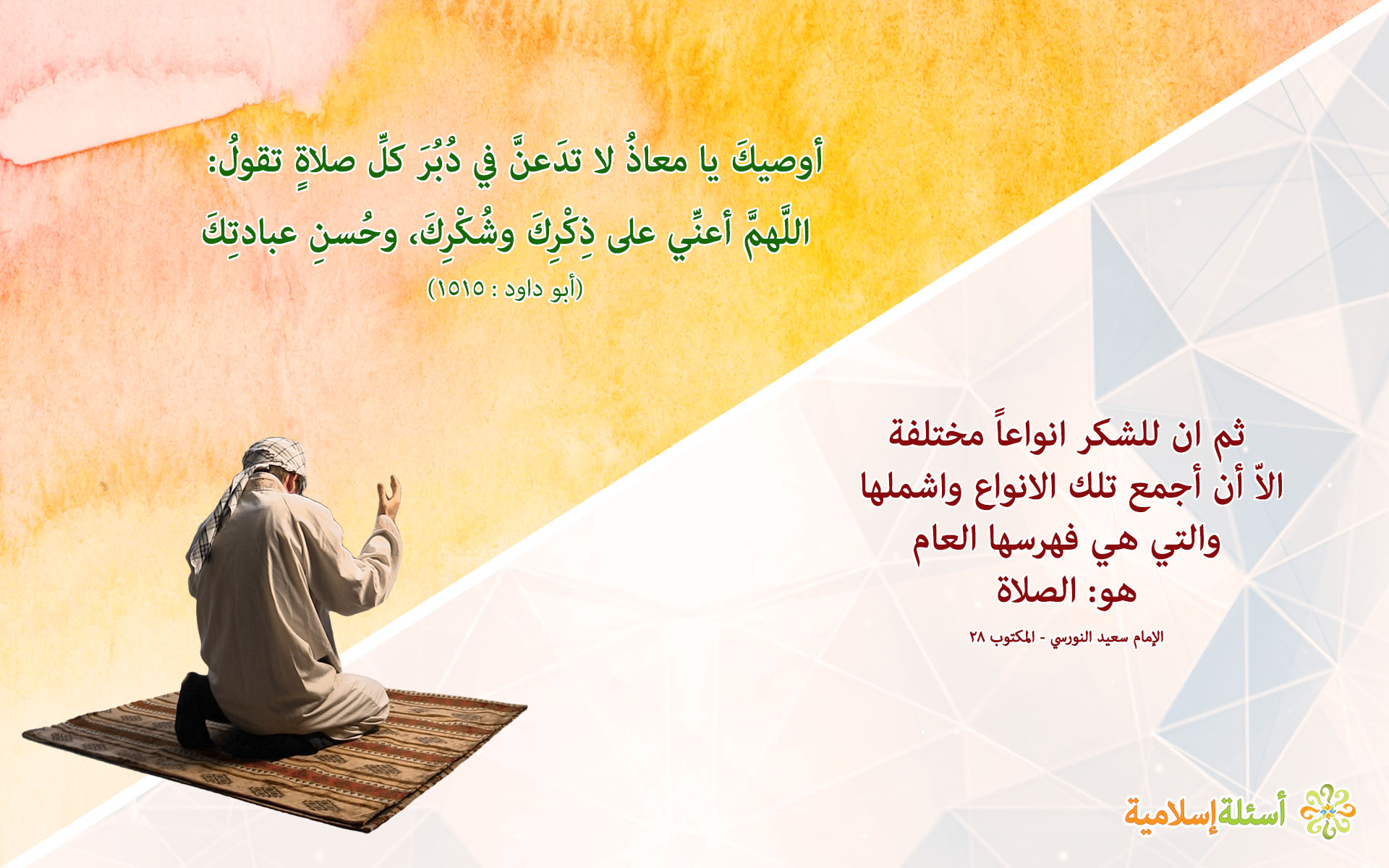 أوصيكَ يا معاذُ لا تدَعنَّ في دُبُرَ كلِّ صلاةٍ تقولُ: اللَّهمَّ أعنِّي على ذِكْرِكَ وشُكْرِكَ، وحُسنِ عبادتِكَ