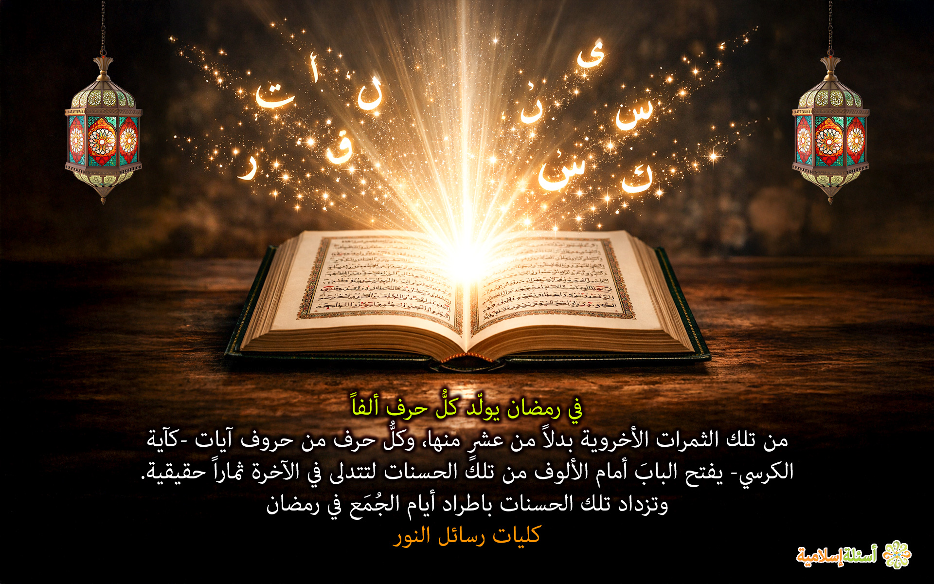 في رمضان يولّد كلُّ حرف ألفاً من تلك الثمرات الأخروية بدلاً من عشرٍ منها، وكلُّ حرف من حروف آيات -كآية الكرسي- يفتح البابَ أمام الألوف من تلك الحسنات لتتدلى في الآخرة ثماراً حقيقية. وتزداد تلك الحسنات باطراد أيام الجُمَع في رمضان
