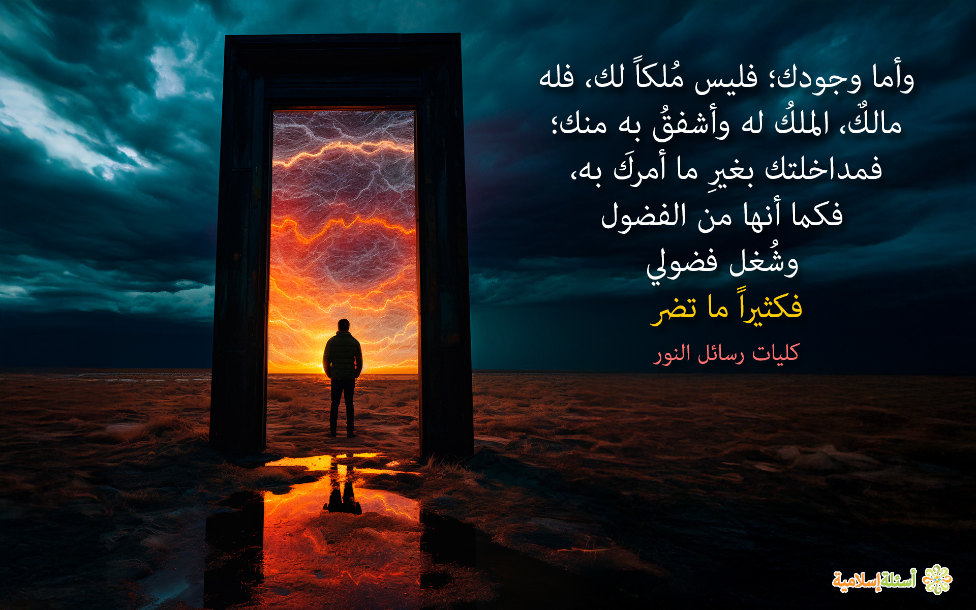 وأما وجودك؛ فليس مُلكاً لك، فله مالكٌ، الملكُ له وأشفقُ به منك؛ فمداخلتك بغيرِ ما أمركَ به، فكما أنها من الفضول وشُغل فضولي فكثيراً ما تضر